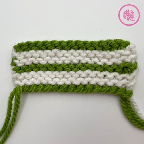 To create this design I used green as my working yarn and a;ternated between a strand of green and strand of white as the long tail the looped over my thumb. (You could also work with three different colors.) I did not work the cast on using both strands. I alternated colors as I picked up loops from my thumb.