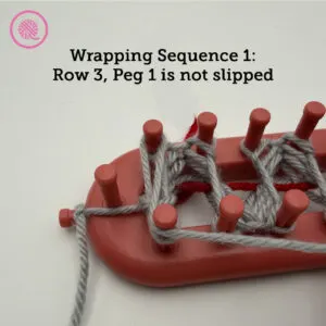 Row 4: (Slip Peg 12 LOWER.) Follow wrapping pattern back to Peg 1 and knit over.