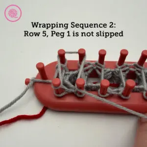 Row 6: (Slip Peg 12 LOWER.) Follow wrapping pattern back to Peg 1 and knit over.