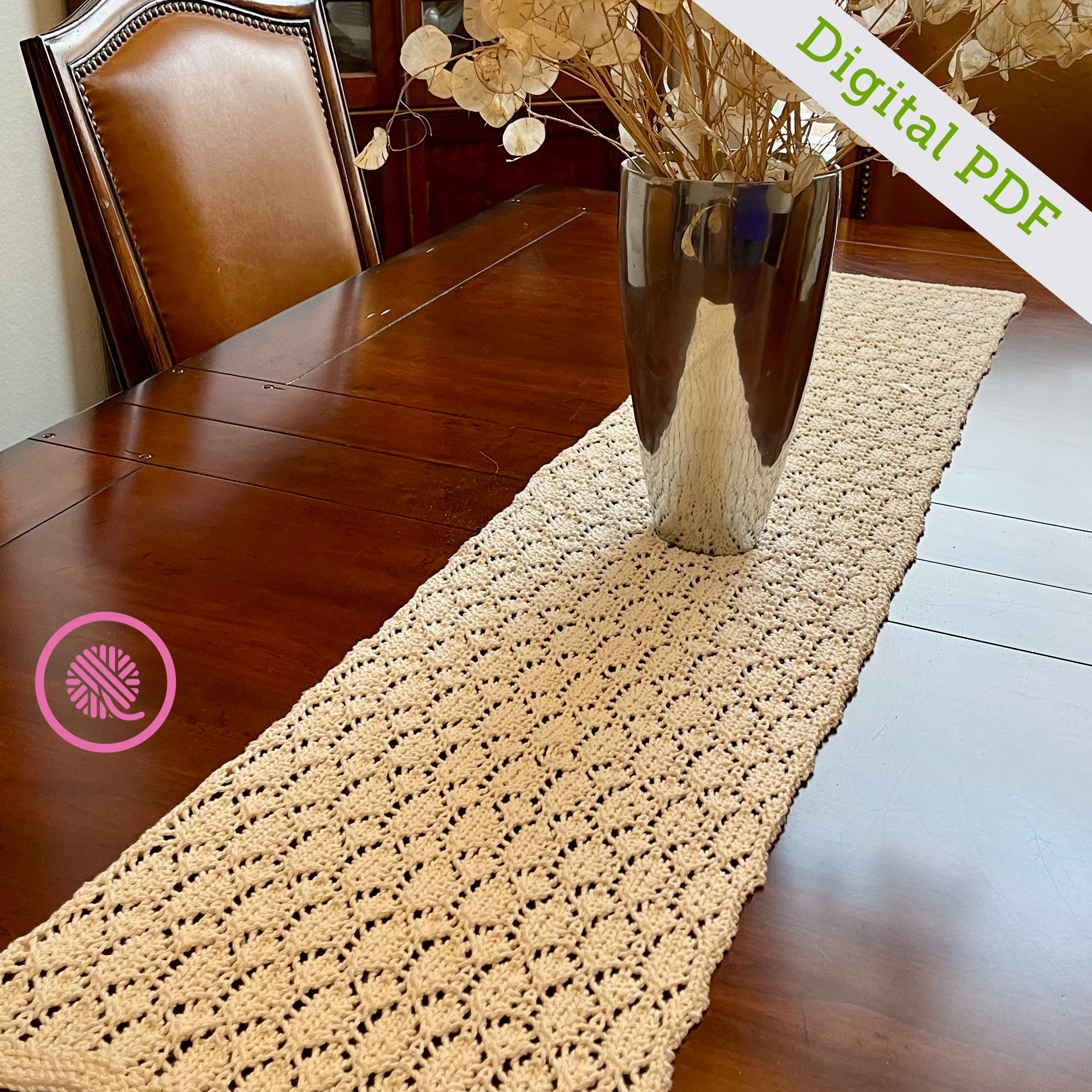 The needle knit Lacy Runner adds a touch of simple elegance to your table. This table runner uses a medium-weight, mercerized cotton yarn that washes well and shows off the beautiful lace design. This pattern features the lofty lace stitch pattern with a garter stitch border.