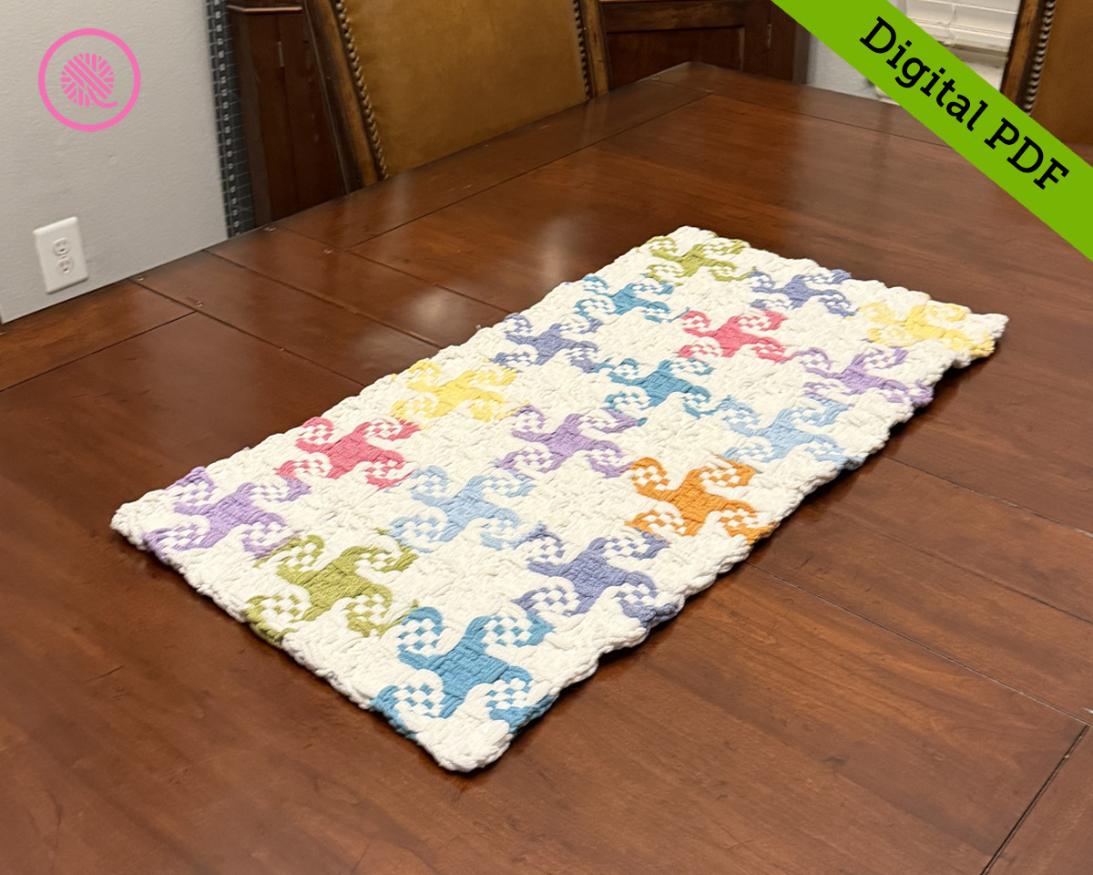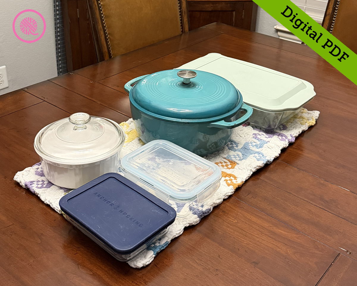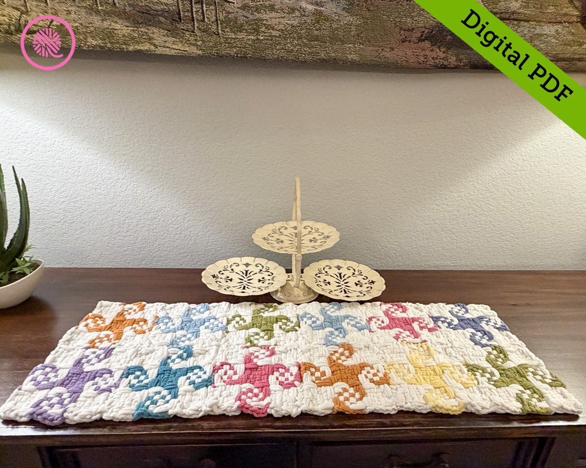 The woven Pinwheel Trivet Runner brings all the spring vibes to your table.  This extra thick cotton runner is designed to be used as a trivet for hot dishes on your table or buffet.  Both sizes are large enough to hold several serving dishes.  Each woven square that makes up the runner has a large pinwheel with a checkered pattern flaring out from the center point.  I designed this to use white as the main color and 8 spring shades for contrast, but I also include options to use fewer colors, if you prefer.