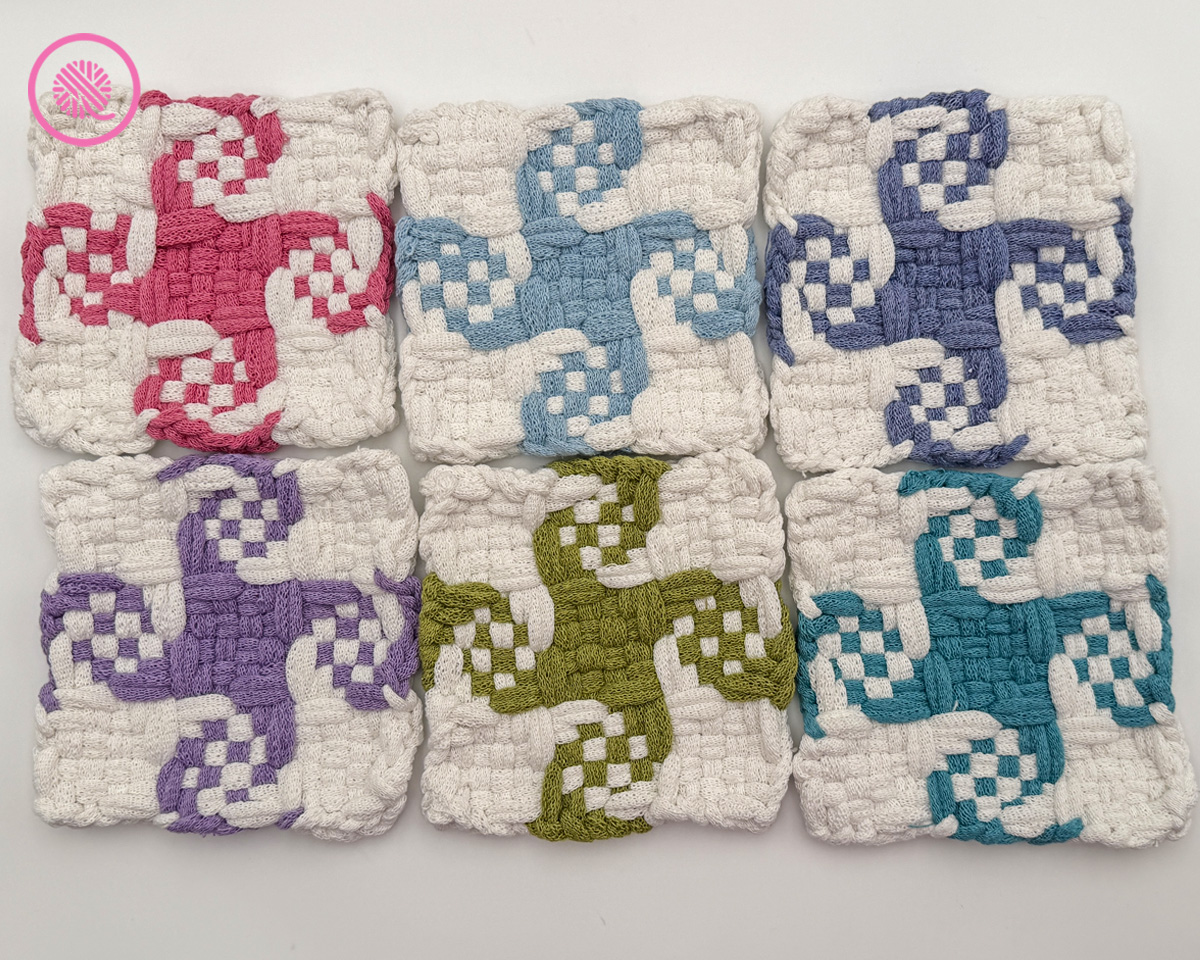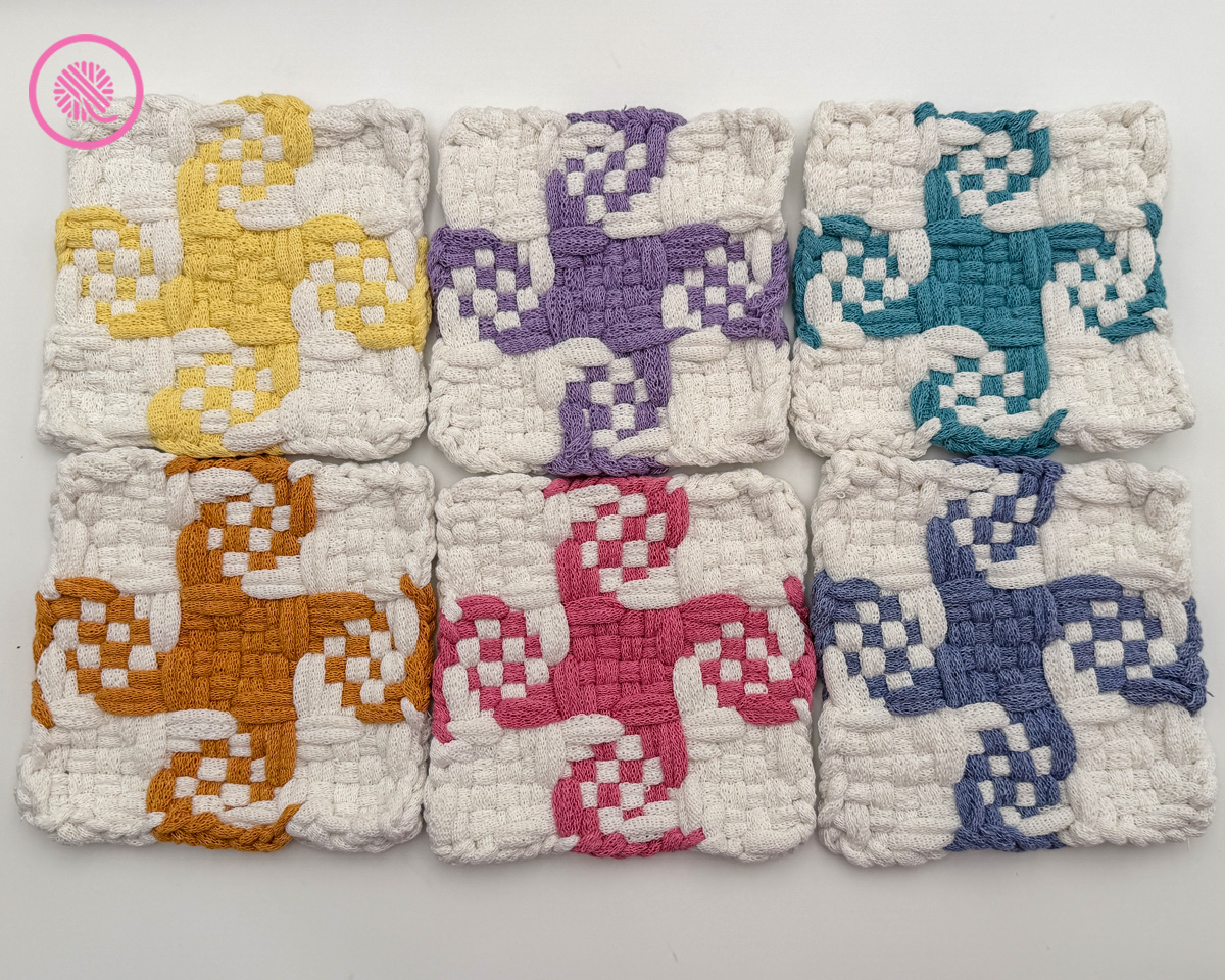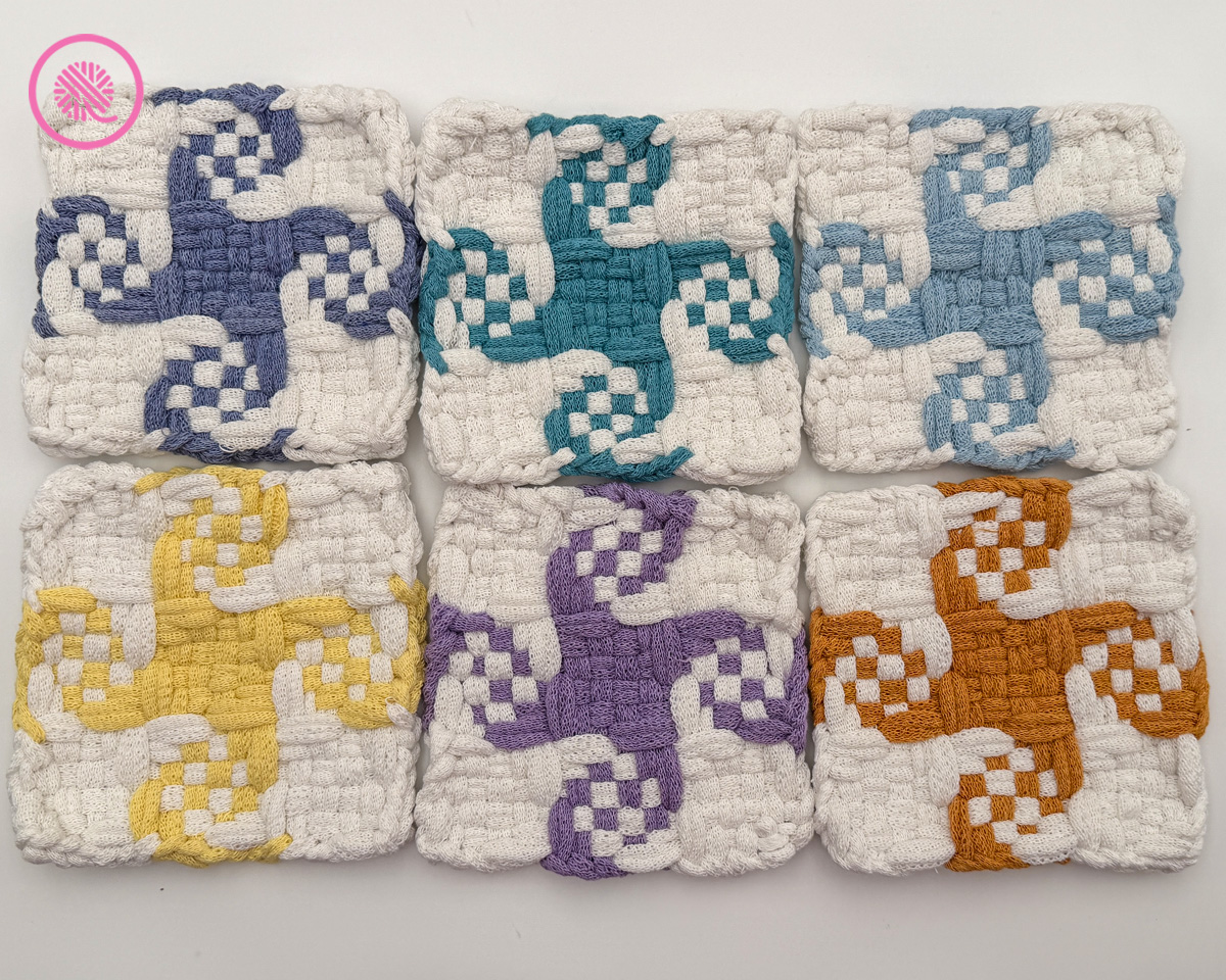This design uses the Checked Pinwheel design with white as the main color paired with 6 different spring colors in each placemat. Each woven motif has a large pinwheel with a checkered pattern flaring out from the center point. Each of the 6 placemats uses a unique color sequence. I also include options to use fewer colors.