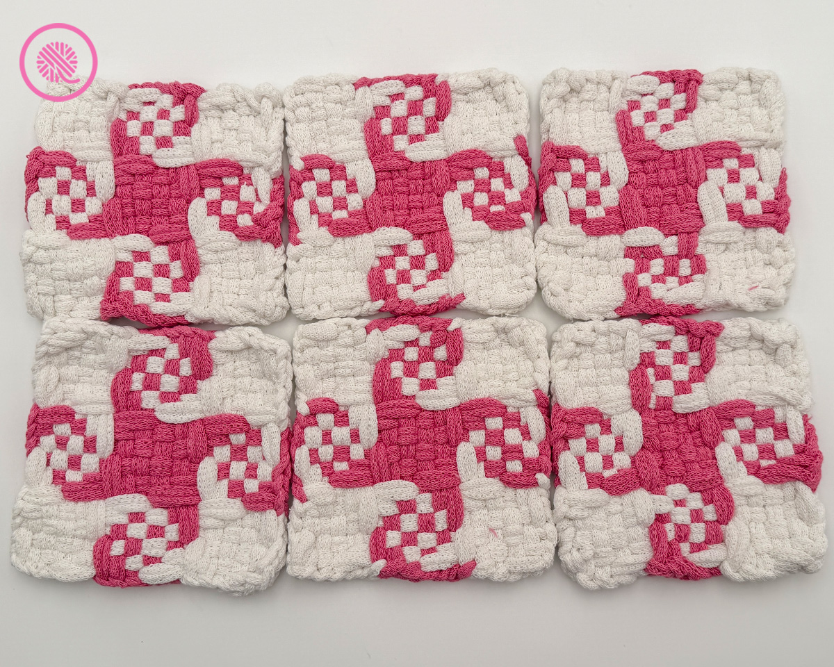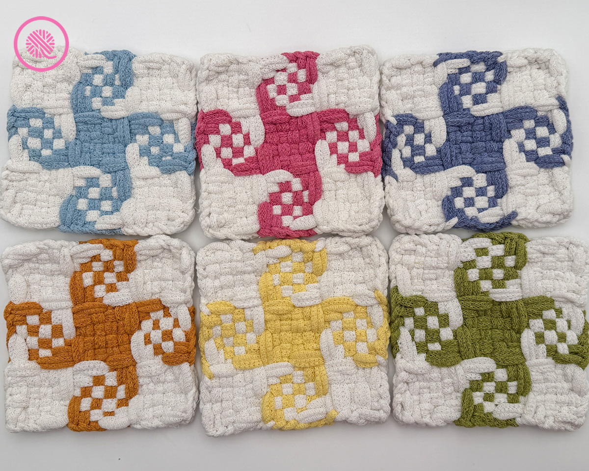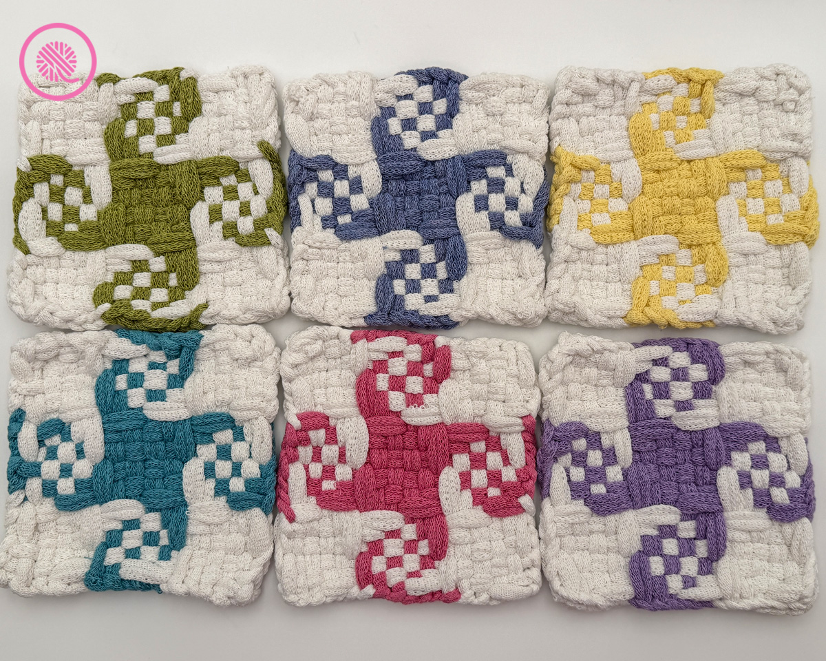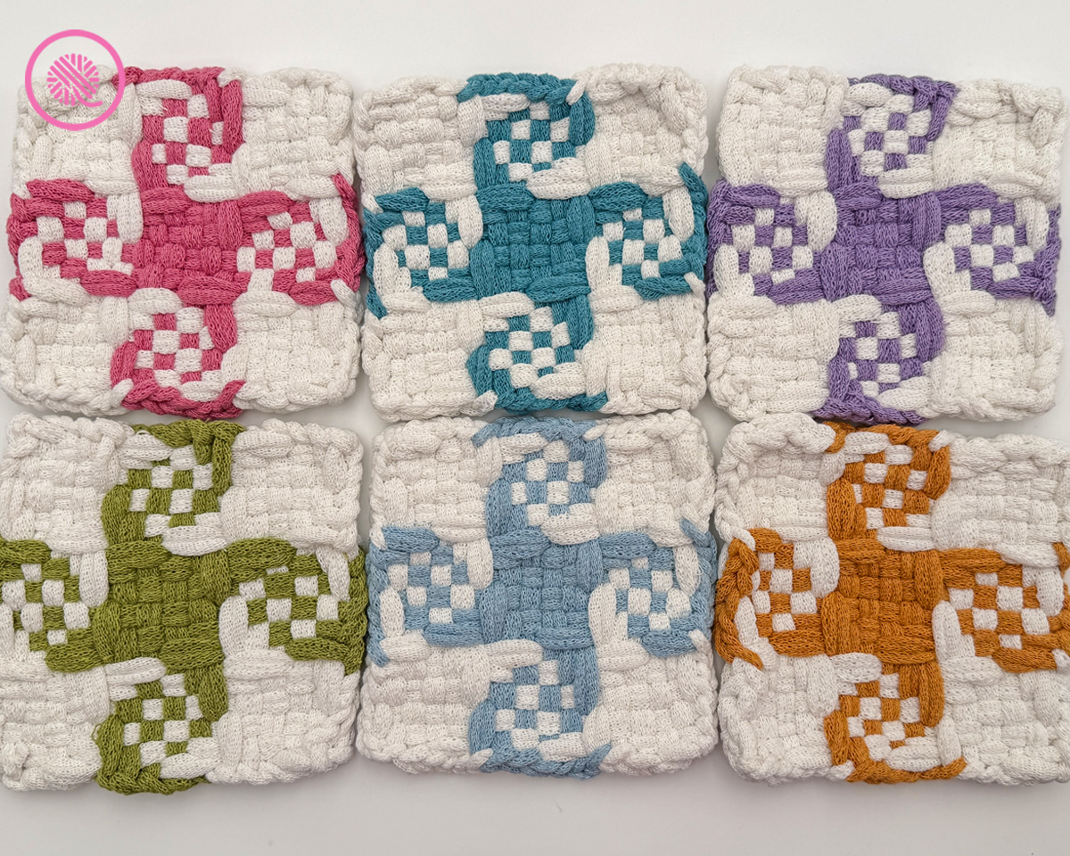 This design uses the Checked Pinwheel design with white as the main color paired with 6 different spring colors in each placemat. Each woven motif has a large pinwheel with a checkered pattern flaring out from the center point. Each of the 6 placemats uses a unique color sequence. I also include options to use fewer colors.