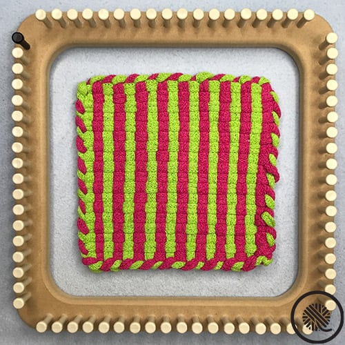 - When all loops are off the loom remove the last loop from the crochet hook and weave in to pot-holder.